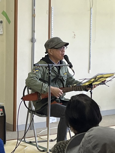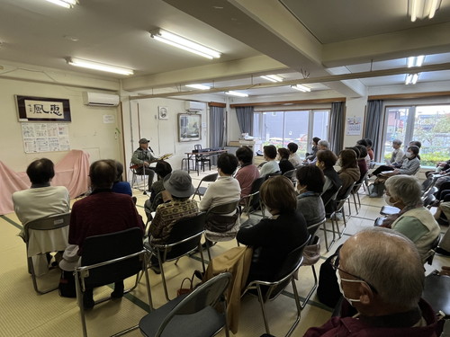 芸術の秋!、雨がポツリポツリと降る中、暖かい憩の家の中で、生演奏に耳を傾け、一部の曲では合唱で楽しみました。