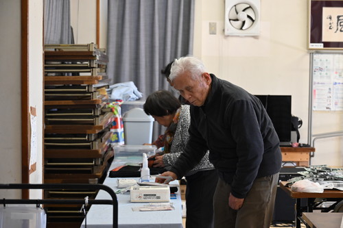 ビンゴで楽しもう ・・・ ビンゴマシンの操作は大忙し。番号は白板にも書き出します